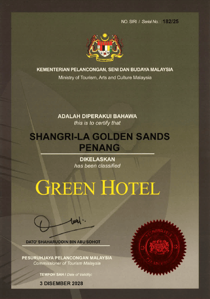 Shangri-La Golden Sands, Penang has secured official endorsement from Malaysia’s Ministry of Tourism, Arts and Culture (MOTAC) as an environmentally friendly accommodation, marking a significant milestone in the property’s four-decade commitment to sustainable hospitality.
