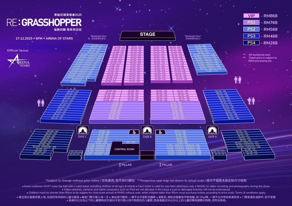 Tickets for the RE: Grasshopper Concert Tour 2025 will be available for pre-sale to Genting Rewards Card (GRC) Gold members and above from 12 September at 12 pm. Public sales will commence on 17 September at 3 pm. Ticket prices are set at RM 868 (VIP), RM768 (PS1), RM568 (PS2), RM468 (PS3), and RM268 (PS4). A processing fee of RM4 applies per ticket. GRC members will receive an exclusive 10% discount for VIP to PS3 categories. Further information and ticket purchases can be made via rwgenting.com.