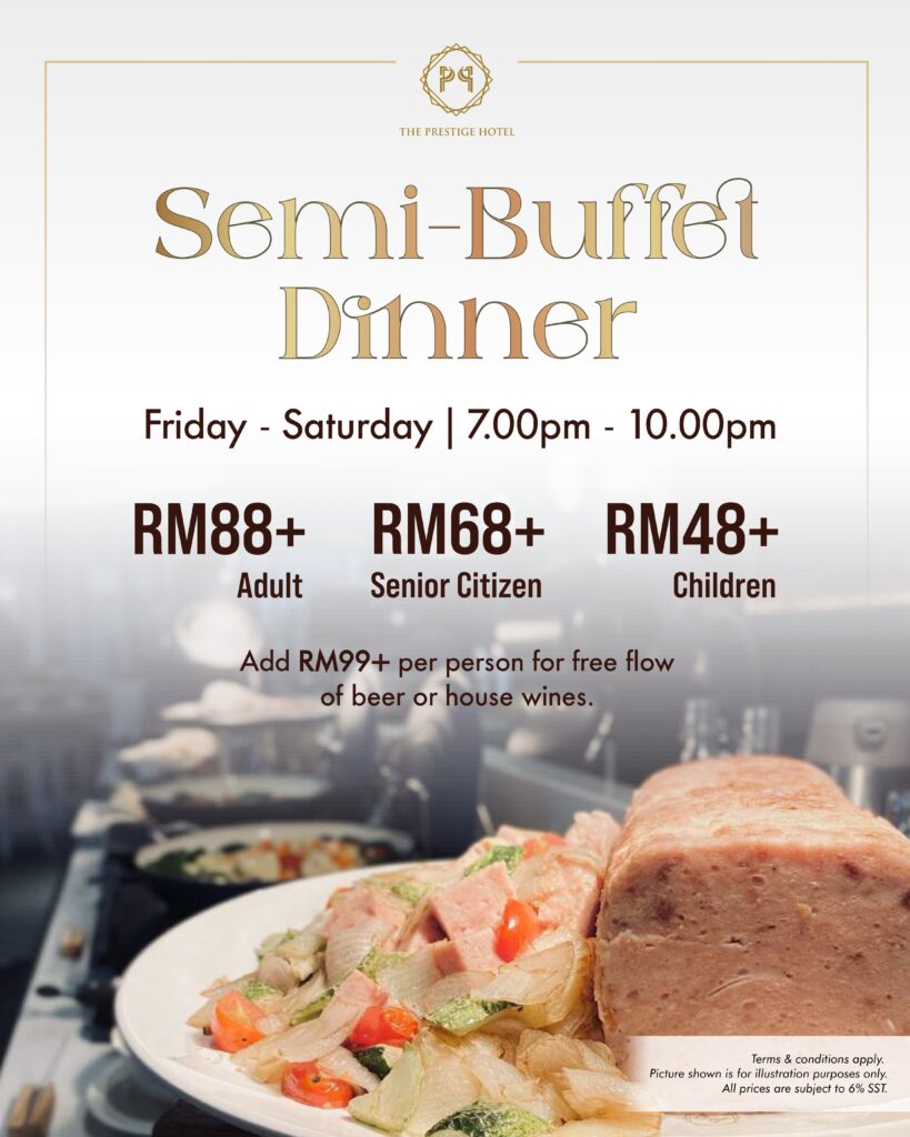 Add RM388 nett for free flow of Prosecco, wines, beers and house pouring spirits.