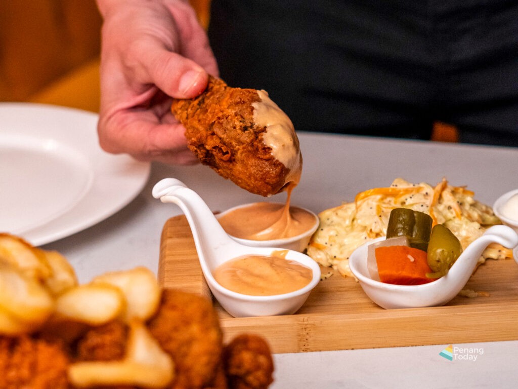 Each order of the signature chicken comes with cocktail sauce, mayonnaise, garlic sauce, pickles, potato wedges, and coleslaw. Customers can enjoy the chicken with bread or simply dip it in the various sauces provided.