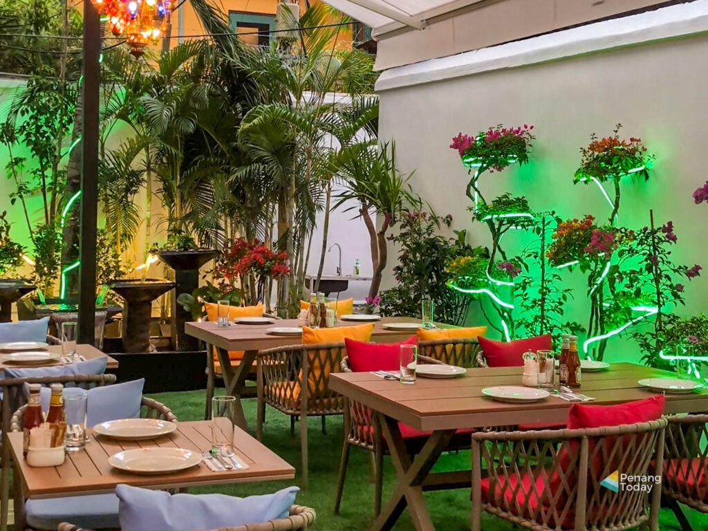Visitors entering through the glass doors will immediately notice the elegant and colourful interior. The design transforms the dining space into what feels like a Middle Eastern realm, offering customers a unique dining environment in Penang.