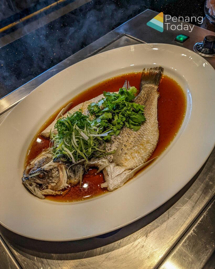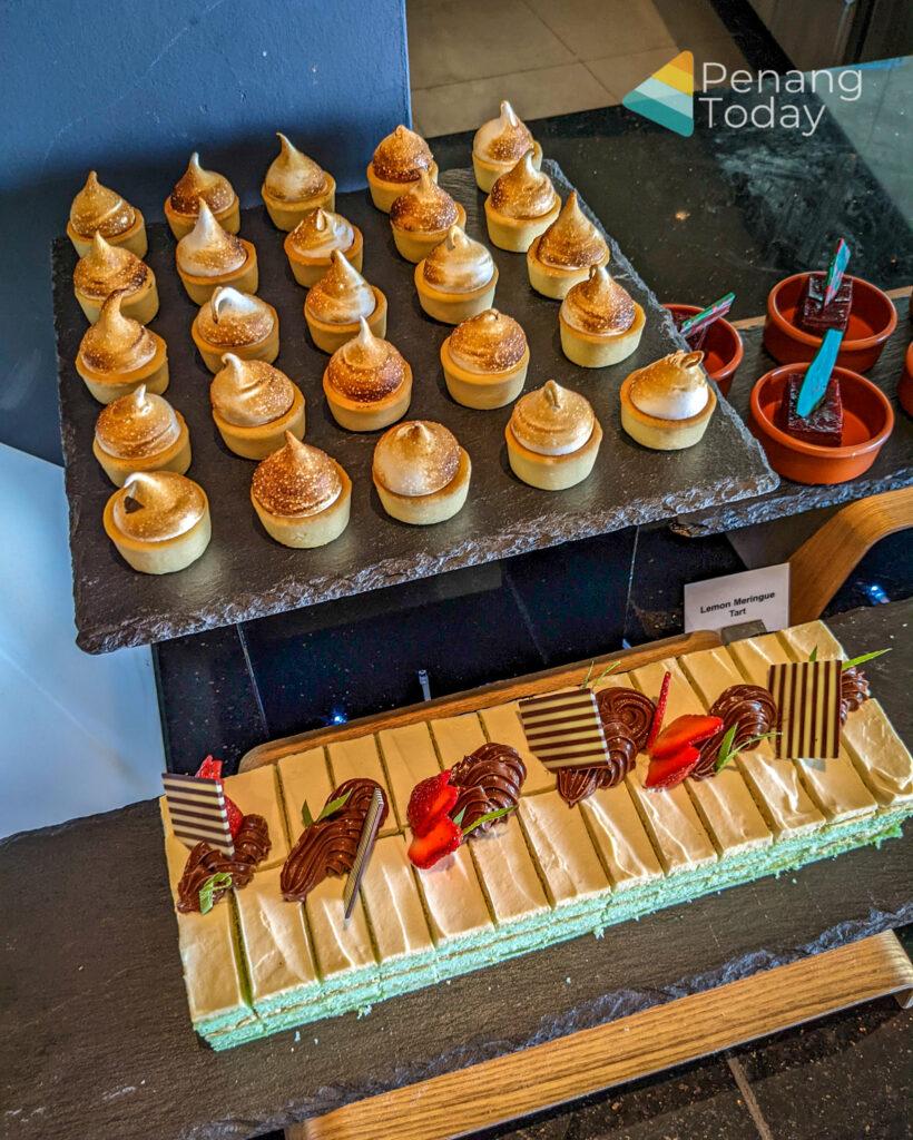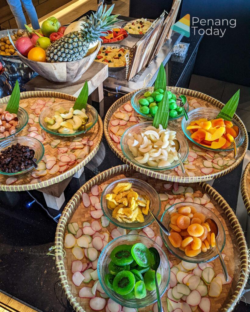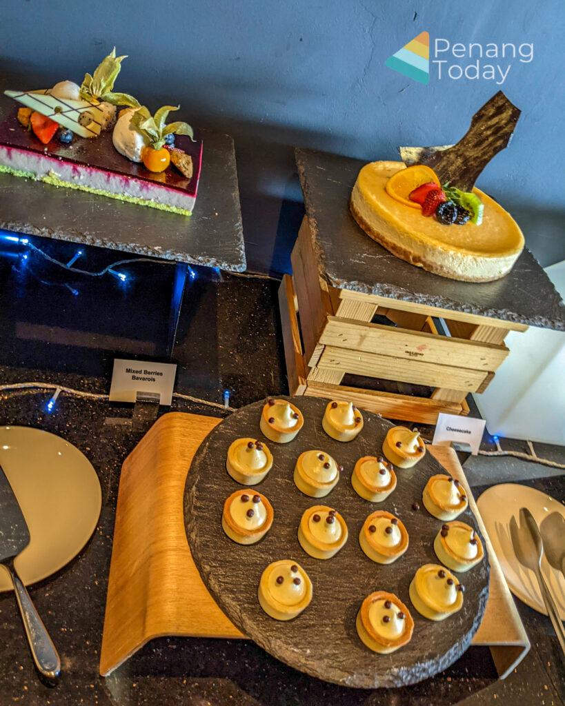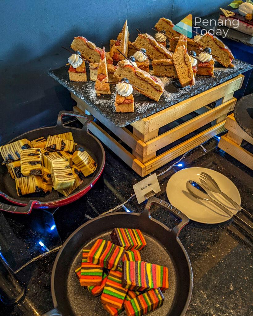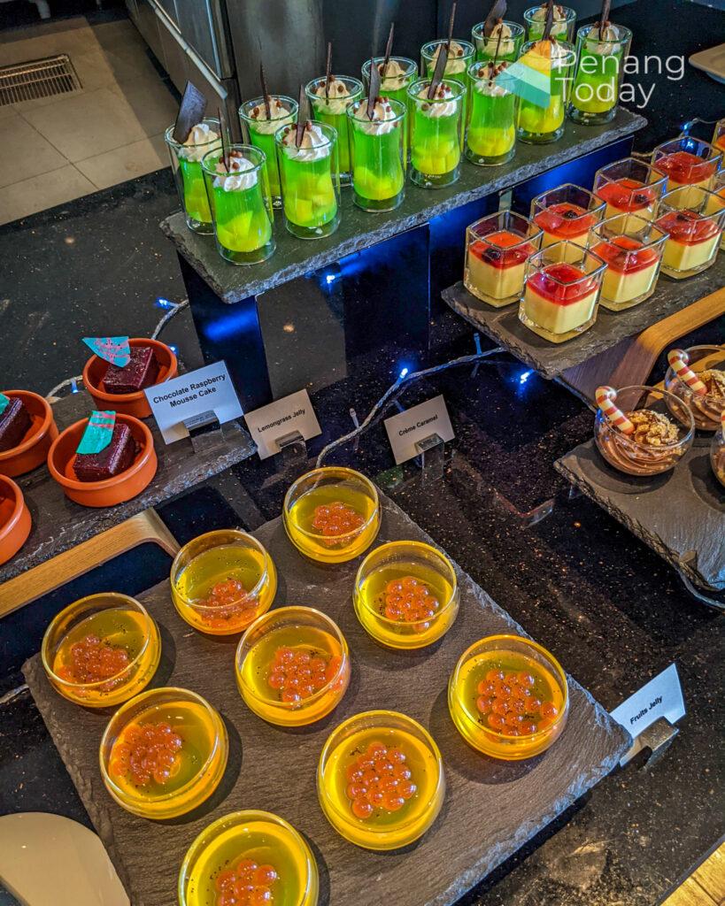 Desserts include iced syrups, a chocolate fountain of vanilla sponge, honey dew, pineapple, churroz and cream puffs, ice cream, bitter chocolate cake, mixed berries bavarois, assorted nyonya kuih, lemongrass jelly, cheese cake, linzer torte, crème caramel, air batu campur and assorted cut fruits.