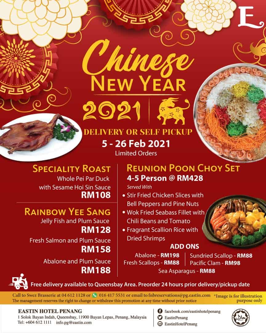 All are available for orders when they call or Whatsapp 016 417 5531. Delivery will be from the 5-26 February 2021. Please ensure to order 24 hours prior to delivery. For more information and reservations, contact Eastin Hotel Penang at 04-612 1128 or you can also email at [email protected] / log in to the website www.eastin.com