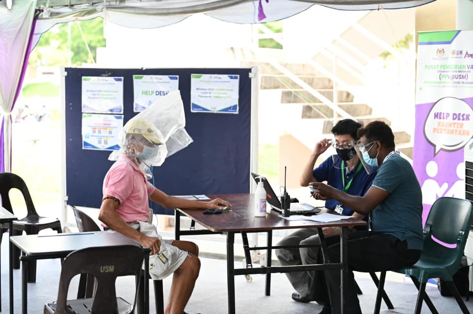 As he was seated for his vaccination, it can be seen that the insides of the plastic bag turning foggy. We can only assume that he is trying to protect himself from airborne variant for this matter.