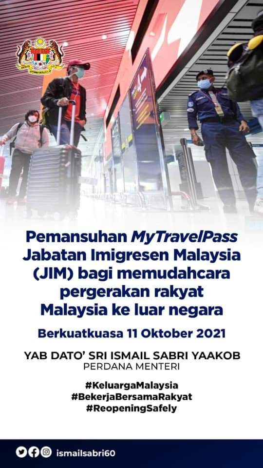 He added that MyTravelPass will be abolished from 11th October 2021 to ease travel of Malaysians out of the country. Quarantine is still applicable for those returning into the country.