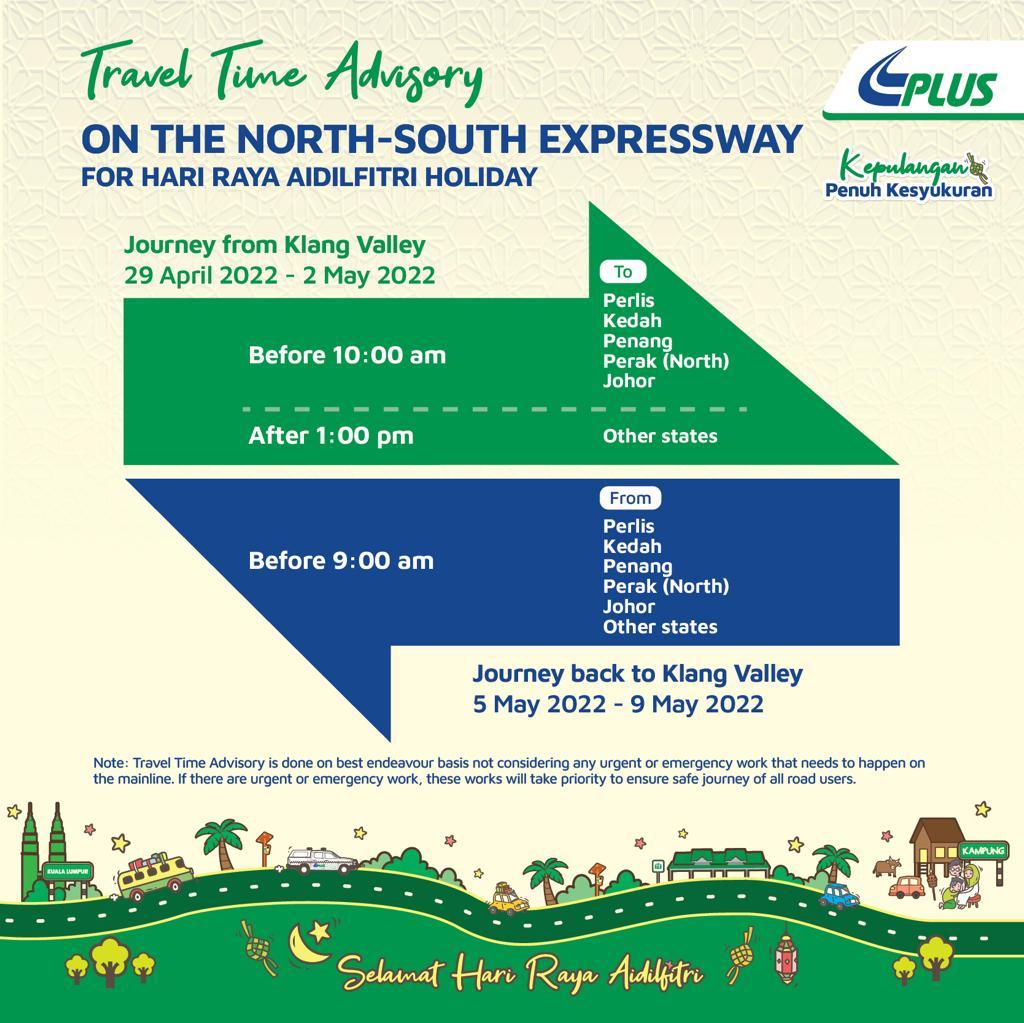 PLUS Malaysia Berhad (PLUS) is issuing a 2022 Balik Kampung and Pulang Ke Bandar Travel Time Advisory (TTA) schedule in conjunction with the Hari Raya Aidilfitri festive season which caters for highway travel from April 29 till May 9, 2022.